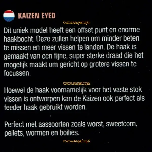 Hoewel de haak voornamelijk voor het vaste stok vissen is ontworpen kan de Kaizen ook perfect als feeder haak gebruikt worden.