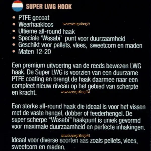 Een premium uitvoering van de reeds bewezen LWG haak. De Super LWG is voorzien van een duurzame PTFE coating en brengt de haak daarmee naar een compleet nieuw niveau op het gebied van scherpte en kracht.
