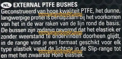 Geconstrueerd van hoge kwaliteit PTFE, het dunne, langwerpige profiel isbehulpzaam bij het voorkomen van het in de war raken van de lijn rond debasis. De bussen zijn zodanig gevormd dat het elastiek er zonder weerstandte ondervinden doorheen glijdt, in de range vind je een formaat geschiktvoor elk type elastiek vanaf de lichtste in de Slip-range tot en met het zwaarste Hollo elastiek.