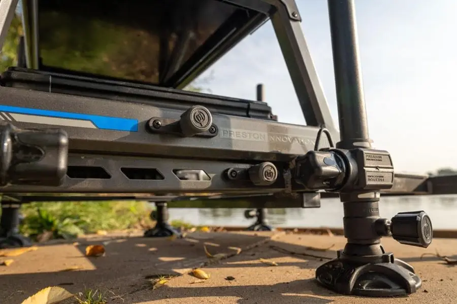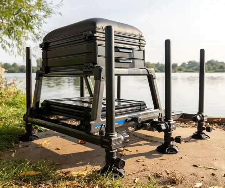 De cassette onder het frame bevat een 26mm bak en deksel waar indien nodig extra units aan toegevoegd kunnen worden. De box wordt geleverd met x6 telescopische poten voor moeiteloze fijne afstellingen aan de oever.