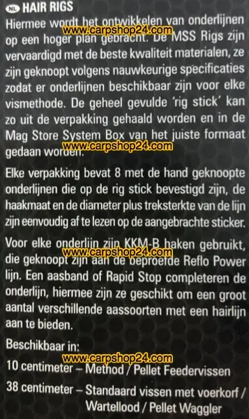 Hiermee wordt het ontwikkelen van onderlijnen op een hoger plan gebracht. De MSS Rigs zijn vervaardigd met de beste kwaliteit materialen, ze zijn geknoopt volgens nauwkeurige specificaties zodat er onderlijnen beschikbaar zijn voor elke vismethode. De geheel gevulde ‘rig stick’ kan zo uit de verpakking gehaald worden en in de Mag Store System Box van het juiste formaat gedaan worden. Elke verpakking bevat 8 met de hand geknoopte onderlijnen die op de rig stick bevestigd zijn, de haakmaat en de diameter plus treksterkte van de lijn zijn eenvoudig af te lezen op de aangebrachte sticker. Voor elke onderlijn zijn KKM-B haken gebruikt, die geknoopt zijn aan de beproefde Reflo Power lijn. Een aasband of Rapid stop completeren de onderlijn, hiermee zijn ze geschikt om een groot aantal verschillende aassoorten met een hairlijn aan te bieden.