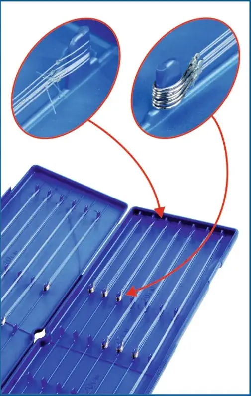 Opbergdoos voor onderlijnen ontworpen om een grote hoeveelheid onderlijnen in te bewaren en te beschermen. Compact en ultralicht, is voorzien van 13 bevestigingsposities en kan meer dan 100 onderlijnen bevatten, klaar voor gebruik. De maat van de steunpennen is voldoende zowel in diameter als in lengte om zelfs kleine haken en lussen te kunnen bevestigen. De lengte van de onderlijnen is duidelijk aangegeven in de opbergdoos.
